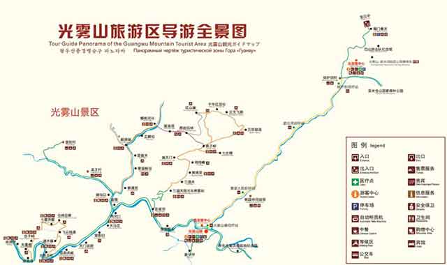 由于光雾山景区非常的大,总体上可以分为桃园(光雾山景区)、大坝(米仓山景区)、十八月潭三个景区。